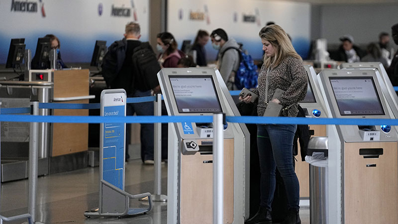 A traveler uses a kiosk to check her bags in front of the American Airlines ticketing gate at Dallas-Fort Worth International Airport on Nov. 22, 2022, in Grapevine, Texas. (AP Photo/Tony Gutierrez, File)
